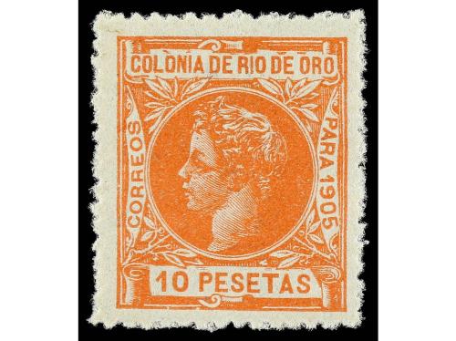 ** COLONIAS ESPAÑOLAS: RIO DE ORO. Ed. 15/6N. 5 p. azul y 10 p. rojo. Numeración ceros. Cat. +700€.