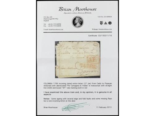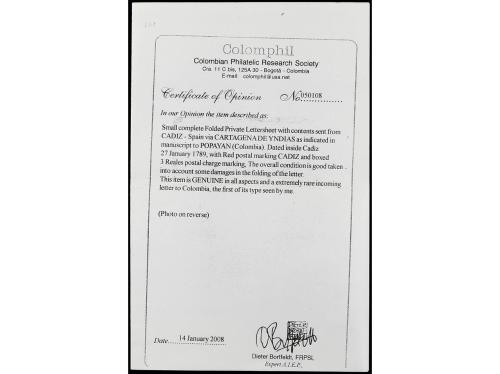 COLOMBIA. 1789 (27 enero). CÁDIZ a POPAYAN (Colombia). Carta completa con texto (texto con algunas faltas de papel y roturas en los pliegues). Marca lineal CADIZ y 3P (3 reales de Plata a pagar en destino), manuscrito "Por Cartagena de Indias" . MUY RARA, una de las cartas transatlánticas conocidas llegadas a Colombia. Cert. D. BORTFELDT y BRIAN MOORHOUSE.