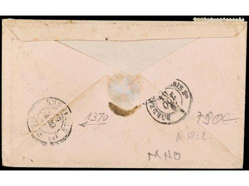 FRANCIA. Yv. 21, 22, 29. 1867. BERGERAC. Sobre con franqueo de 10 cts. bistre y 20 cts. azul + 20 cts. azul (Lauré). Rara combinación de franqueo con sellos de 20 cts. azul distintos.