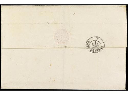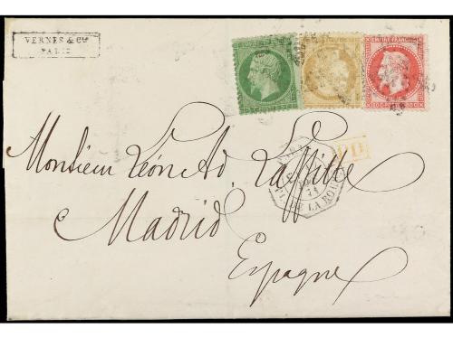 FRANCIA. Yv. 32, 35, 59. 1871. PARÍS a MADRID. 5 cts verde, 15 cts. bistre y 80 cts. rosa. Fechador octogonal PARIS / PL. DE LA BOURSE. Rara combinación de franqueo.