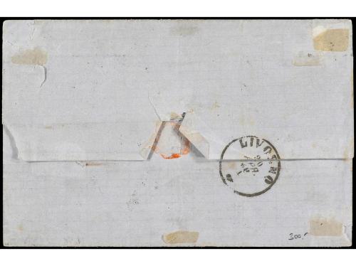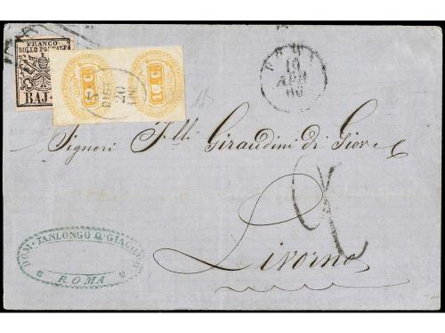 ITALIA ANTIGUOS ESTADOS: ESTADOS PONTIFICIOS. Sa. 6. 1866. ROMA a LIVORNO. 5 baj. rosa, tasada a la llegada con una pareja del 10 cents. amarillo con mat. ovalado de llegada a Livorno. Muy bonita.