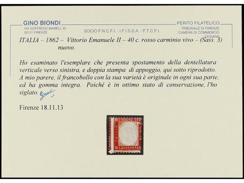 * ITALIA. Sa. 3t. 40 cts. rojo DENTADO DESPLAZADO a la izquierda. Cert. BLONDI.