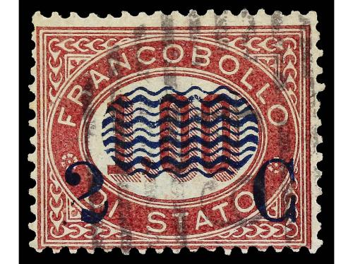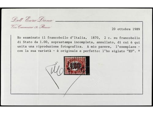 ° ITALIA. Sa. 33 var. 2 c. sobre 1 l. Variedad SOBRECARGA PARCIALMENTE OMITIDA. RARO y no reseñado. Cert. E. DIENA.