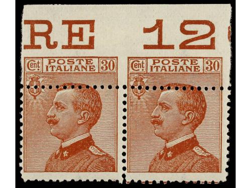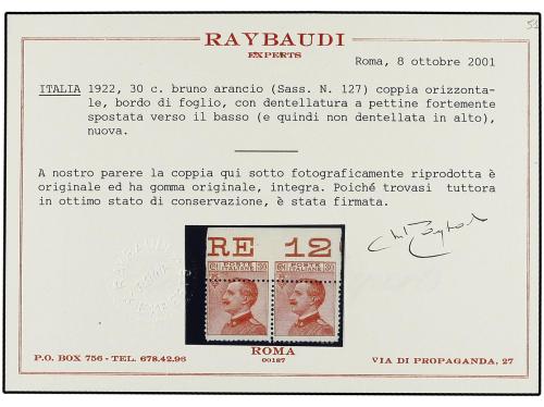 ** ITALIA. Sa. 127db. 30 cts. castaño naranja. Pareja DENTADO SUPERIOR DESPLAZADO. Cert. RAYBAUDI. Sassone 400€.