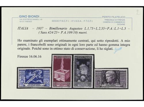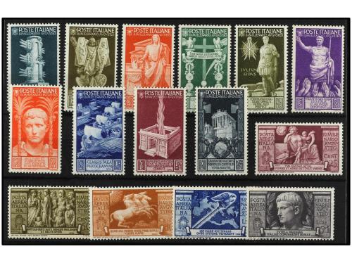 ** ITALIA. Yv. 396/405+Av.102/6. 1937. BIMILENARIO AUGUSTO. Serie completa. 15 valores. Valores clave cert. G. BIONDI. Cat. 550€.