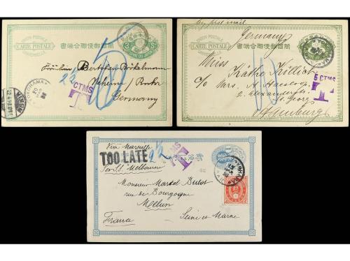 JAPON. 1896-98. Tres Enteros Postales de Japón circuladas a Alemania y Francia con tasas de 2 1/2 cts. (2) y 5 cts.