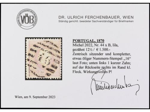 ° PORTUGAL. Mu. 46. 240 reis lila, mat. óvalo con cifra "16" de Carregado. Muy bonito ejemplar. Cert. FERCHENBAUER. Cat. 1.600€.