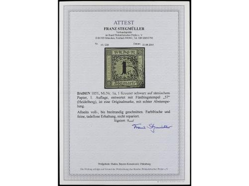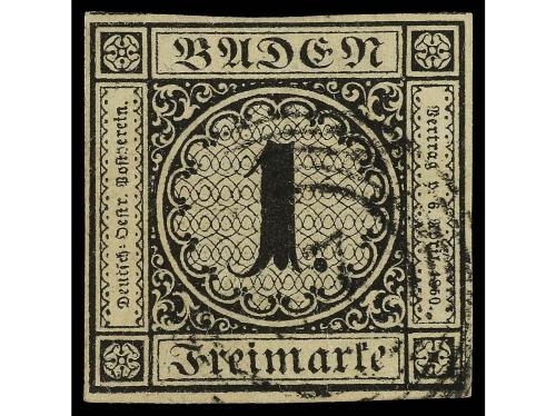 ° ALEMANIA ANTIGUOS ESTADOS: BADEN. Yv. 1. 1851. 1 kr. bistre. MUY BONITO EJEMPLAR. Cert. F. STEGMULLER.