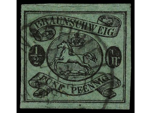 ° ALEMANIA ANTIGUOS ESTADOS: BRUNSWICK. Yv. 6. 1853-65. 1/2 gr. negro s. verde. MUY BONITO. Firma Brette.