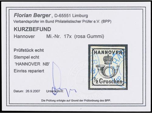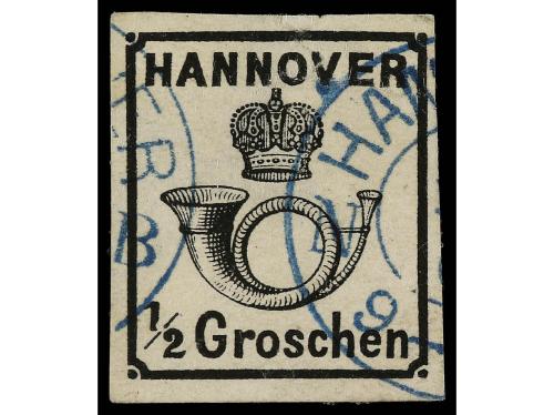 ° ALEMANIA ANTIGUOS ESTADOS: HANNOVER. Yv. 16a. 1859. 1/2 gr. negro goma rosa (Mi. 17x). MUY BONITO. Dictamen F. Berger.
