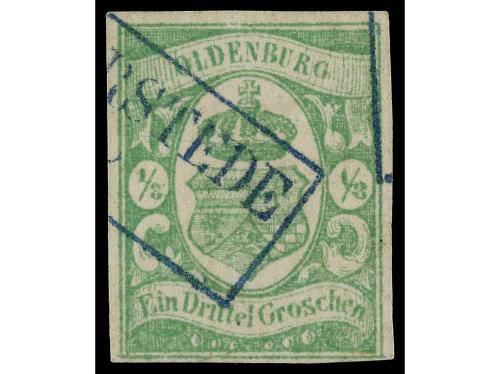 ° ALEMANIA ANTIGUOS ESTADOS: OLDENBURGO. Yv. 10. 1860. 1/3 g. verde azul. MUY BONITO. Firma G. Buhler.