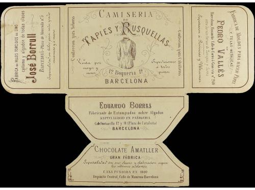 ESPAÑA. Ed. 175, 188. 1877 (20 Noviembre). SOBRE ANUNCIADOR vendido por PRAT y MATEOS en Barcelona con publicidad colectiva en el interior y en el reverso. Este tipo de sobres se vendían con los sellos adheridos, por un valor inferior al nominal, en este caso por 15 cts. Rarísimo en esta emisión, probablemente se trate de la fecha más antigua conocida del uso de este tipo de sobres de publicidad en España.