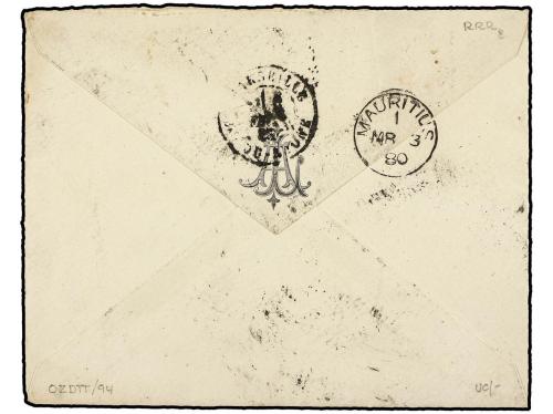 ESPAÑA. Ed. 205. 1880. BARCELONA a ISLA MAURICIO. 40 cts. castaño. Circulada vía Marsella y Suez. Al dorso fechador de llegada. Excepcional destinación, única conocida a esta exótica isla en el Sudoeste Africano.