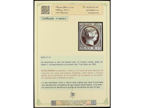 * ESPAÑA. Ed. 18. 12 cuartos violeta. Márgenes completos (el superior algo ajustado) y buen color. Muy buen ejemplar. Cert. GRAUS.