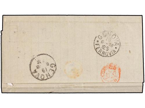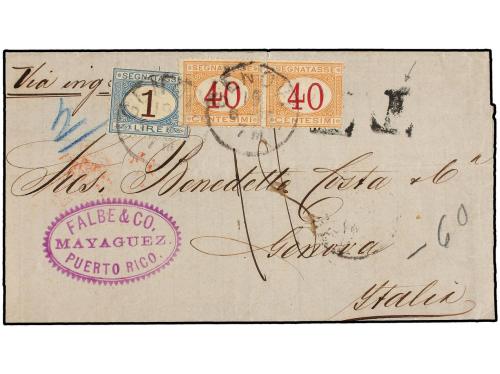 PUERTO RICO. 1878. SAN JUAN a GÉNOVA (Italia). Carta circulada sin franqueo, rara marca de tasa doble ´T´ estampada a la salida, a la llegada tasada con sellos italianos de 40 cts. (2) y 1 Lira. MUY RARA.