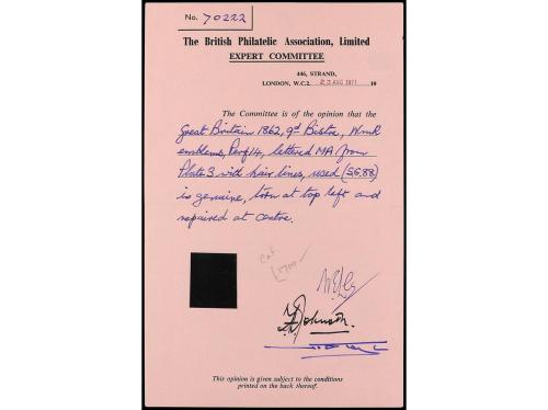 ° GRAN BRETAÑA. Yv. 23, S.G.88. 1862. 9 p. bistre, plate 3. Cut at top left and repaired at center. RARE. Cert. B.P.A (1971). Cat. 11.000€.