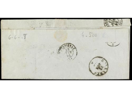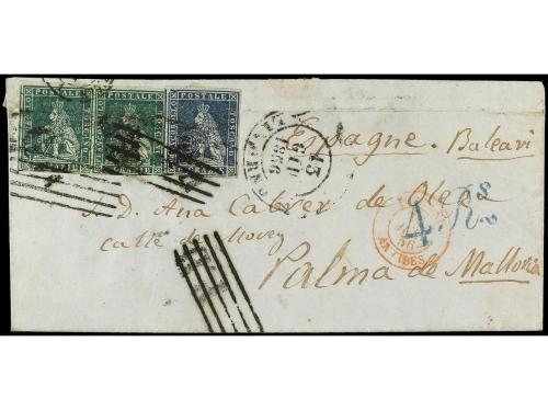 ITALIA ANTIGUOS ESTADOS: TOSCANA. 1856. LIVORNO a PALMA DE MALLORCA. 4 cr. verde (2) 6 cr. azul, tasada a la llegada con 4 reales. Doblez horizontal de archivo.