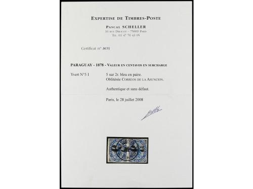 ° PARAGUAY. Sc. 7 (2). 5 s. 2 reales azul. Pareja sobrecarga horizontal. PRECIOSA y RARA. Cert. P. SCHELLER. Cat. 850€.