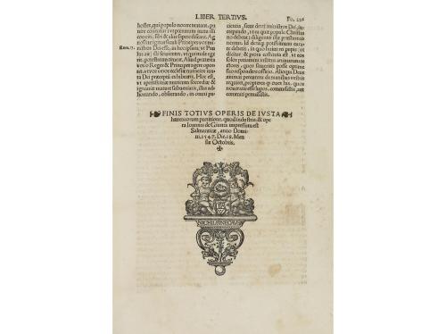 1547. LIBRO. (DERECHO-HEREJÍA). CASTRO, ALFONSI A:. DE IUSTA HAERETICORUM PUNITIONE LIBRI TRES. Salmanticae: Ioannes Giunta, 1547. 4º mayor. 14 h. + 226 fol. Texto a dos columnas. Portada en orla arquitectónica xilográfica. Alguna antigua anotación marginal o subrayado de época. Capitales xilográficas. Ejempar restaurado. Enc. en pergamino restaurado, lomera rotulada. Ex-libris. La obra intenta explorar y proponer la justa medida entre el castigo al hereje y su restauración a la fe, a la vez que intenta explicar el fenómeno de la herejía. Obra enmarcada principalmente en la época de expansión del protestantismo por Europa. CCPB 570802-8. Palau 49077. Primera Edición.