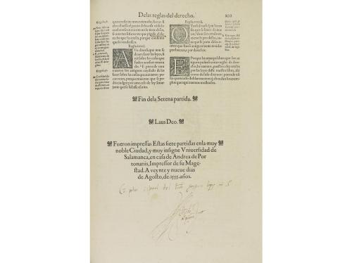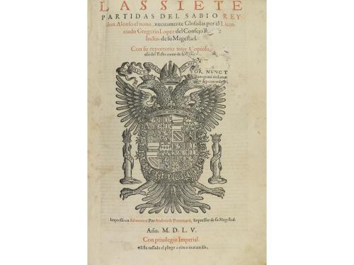 1555. LIBRO. (DERECHO). LAS SIETE PARTIDAS DEL SABIO REY DON ALFONSO EL NONO, NUEVAMENTE GLOSADAS POR EL LICENCIADO... Salamanca: Andrea de Portonaris, 1555. 4 vol. en gran folio. I: portada a dos tintas con gran escudo imperial, 151 fol. + 116 fol. + 186 fol. Corresponden a las tres primeras partidas. La primera portada tiene una leve pérdida por debilitamiento del papel que afecta muy levemente el escudo (y el texto en verso). II: 73 fol. + 112 fol. Corresponden a las partidas 4ª y 5ª. III: 116 fol. + 102 fol. (en realidad son 102, es error de foliación) + 2 h., corresponden a la 6ª y 7ª partida [sigue:] TABLA DE LAS LEYES... 18 h. + INDEX MATERIARUM... 31 h. en el fol. 109 de la partida 6ª rasgadura con levísima pérdida con mancha oleosa y cerco de humedad en la portada. IV: REPERTORIO MUY COPIOSO DEL TEXTO LEYES DE LAS SIETE PARTIDAS... Valladolid: Diego Fernandez de Cordova, 1588. 61 h. [sigue:] OMNES FERE TITULITAM IURIS CIVILIS, QUAM CANONICI LEGUNTUR IN ISTIS SEPTEM PARTITARUM LEGIBUS, QUOD SEQUENS... Vallisolti: Apud Didacum Fernandez a Cordova, 1588. 8 h. [Sigue:] INDEX SEU REPERTORIUM MATERIARUM AC UTRIUSQUE IURIS... Id. Sin foliar sign. A6- Z6, Aa6- Qq6. Cuatro vol. enc. en pasta española, en el s. XVIII, con doble tejuelo, nervios, el primer vol. con la piel algo seca, cortes pintados. Cada volumen presentado en una petaca de cartoné, moderna. Los primeros pliegos del primer vol. algo cortos de margen superior. Alguna finísima galería marginal, sin afectar caja de texto. Ocasionales anotaciones manuscritas de época y una inscripción que hace referencia Gregorio López al final de la séptima partida. Todas las partidas conservan su portada con escudo imperial y el último volumen corresponde al Índice publicado en Valladolid. Esta revisión de Gregorio López, publicada por primera vez en 1555 en Salamanca, fue declarada el texto único y legal, pues el descuido de copistas e impresores había llegado a introducir cambios en el texto que falseaban el sentido de la propia ley. Palau 7091.