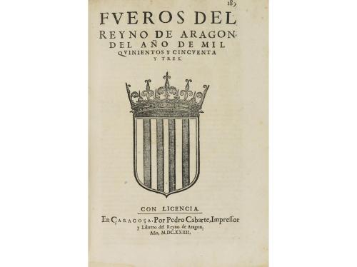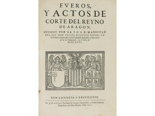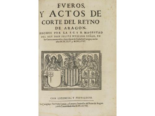 1624. LIBRO. (DERECHO- ARAGÓN). FUEROS Y OBSERVANCIAS DEL REYNO DE ARAGON. Çaragoça: Pedro Cabarte, 1624. Folio. Frontis grabado por Iosephus Vallés + 26 h. + 188 fol. Pequeña falta en la esquina inferior derecha del frontis. Palau 95571. [Sigue:] FUEROS DEL REYNO... MIL QUINIENTOS CINCUENTA Y TRES. Id. de fol. 189 a 216. [Sigue:] ID... MIL QUINIENTOS Y OCHENTA Y CINCO... Id. de fol. 217 a 242. [sigue:] FUEROS... CIUDAD DE BARBASTRO, Y FENECIDAS EN LA DE CALATAYUD, EN EL AÑO M.DCXXVI. Id. Çaragoça: Iuan de Lanaja y Quartanet y Pedro Cabarte, 1627. 4 h. + 68 p. [Sigue:] FUEROS... ÇARAGOÇA... M.DCXLV Y MDCXLVI. Id., 1647. 3 h. + 28 p. Palau 95574. [Sigue:] OBSERVANTIAS CONSUETUDINES QUE REGNI ARAGONUM IN USU COMMUNITER HABITAS. Id.: Pedro Cabarte, 1624. 2 h. + 50 fol. + 53 fol. + 1 h. Colección de fueros aragoneses de la primera mitad del s. XVII, impresos sobre buen papel de época. Texto a dos columnas, con apostillas marginales. Capitales y escudos xilográficos en las portadas y a modo de cule-de-lampe. Enc. en un vol. en pergamino de época, restos de cierres de badana, cortes dorados y cincelados de antiguo.