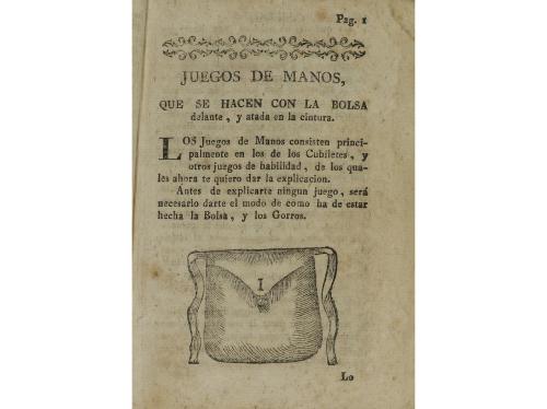 1733 ca. LIBRO. (MAGIA-ILUSIONISMO). MINGUET E YROL, PABLO:. ENGAÑOS A OJOS VISTAS, Y DIVERSION DE TRABAJOS MUNDANOS, FUNDADA EN LÍCITOS JUEGOS DE MANOS, QUE CONTIENE TODAS LAS DIFERENCIAS DE LOS CUBILETES... Madrid: Imp. Pedro Joseph Alonso y Padilla, s.a. (1733, en la aprobación). 6 h. + 217 p. Ilustr. con numerosos grabados xilográficos en el texto. Ligera sombra de óxido. Ejemplar muy usado, algunas hojas con las puntas dobladas. Enc. en pergamino de época, algo mareado.