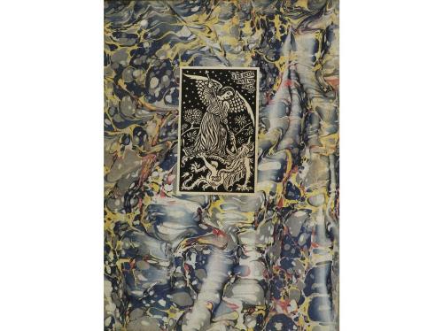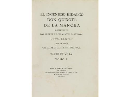 1780. LIBRO. (CERVANTINA). EL INGENIOSO HIDALGO DON QUIXOTE DE LA MANCHA... nueva edición corregida por la Real Academia Española. Madrid: Joaquín Ibarra impresor de Cámara de S.M. y de la Real Academia, 1780. 4 vol. en folio menor. I: Frontis + Portada + 1 h. + XIV p. + CCXXIV p. +199 p. + 6 lám. + retrato de Cervantes + mapa plegado del recorrido del Quijote. II: Frontis + Portada + 1 h. + 418 p. + 9 lám. III: Frontis + Portada + XIV p. + 306 p. + 7 lám. IV: Frontis + Portada + 1 h. + 346 p. + 9 lám. Cabeceras, capitales y culs-de-lampe. En general limpio, aunque ocasionales sombras de óxido. Los 4 vol. con su enc. original en plena piel, con mosaico enmarcado en otro color de piel en ambos planos, ruedas doradas en ambos planos y cantos, doble tejuelo, cortes dorados. Ex-libris xilográfico con el lema "a bo[n] seny no hi val engany", que representa al arcángel San Miguel matando a Satanás, es de Miquel i Planas. Palau 52024: Primera gran edición del Quijote, superior en belleza artística a todas las que hasta entonces se habían realizado en España y en el extranjero. En cuanto a las ilustraciones, las láminas grabadas al cobre, están dibujadas por A. Carnicero, J. del Castillo, J. Brunete, B. Barranco, P. Aral, J. de la Cruz, F. Montaner y otros importantes artistas. El retrato de Cervantes es copia del que regaló el Conde de Águila a la Real Academia, y el mapa es obra de Tomás López. Para el texto, sirvió de modelo el de la edición que por entonces se tenía por primera, es decir, la segunda de Cuesta de 1605, cotejándola con otras (especialmente la del propio Cuesta de 1608) y modificando algún pasaje. La Vida de Cervantes y el Análisis del Quijote son de Vicente de los Ríos, trabajos documentados y que dejan muy atrás todo lo que hasta entonces se había publicado sobre el mismo tema. El papel se fabricó en Cataluña, y se fundieron tipos nuevos. Como se ha visto, también se modificó el título, y se subdividió la obra en dos partes, creyendo en todo interpretar el ideal de Cervantes. Se tiraron 1.600 copias.