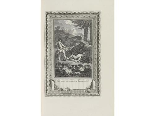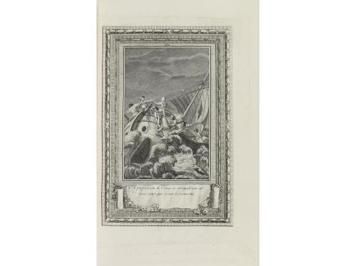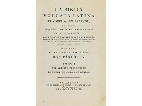 1790-1793. LIBRO. (BIBLIA-SCIO). SCIO DE SAN MIGUEL, PHELIPE [trad.]:. LA BIBLIA VULGATA LATINA TRADUCIDA EN ESPAÑOL, Y ANOTADA CONFORME AL SENTIDO DE LOS SANTOS PADRES Y EXPOSITORES CATHÓLICOS POR EL PADRE... DEDICADA AL REY NUESTRO SEÑOR DON CÁRLOS IV. Valencia: Oficina de Joseph y Thomas de Orga, 1790-1993. 10 vol. en folio menor, 8 vol. para el Antiguo Testamento y dos para el Nuevo Testamento. I: Frontis dibujado por Camarón y grabado por V. Capilla +1 h. + XIV p. + 1 h. (advertencia) + 4 p. + 646 p. + 1 h. Ilustr. con 68 lám. grabadas. II: 1 h. + 4 p. + 591 p. Ilustr. con 34 lám. grabadas. III: 1 h. + 4 p. + 578 p. + 1 h. Ilustr. con 42 lám. grabadas. IV: 1 h. + 4 p. + 699 p. Ilustr. con 37 lám. V: 1 h. + 603 p. VI: 1 h. + 649 p. VII: 1 h. + 669 p. Ilustr. con 9 lám. grabadas. VIII: 1 h. + 480 p. + CXLV p. con índices y tablas cronológicas. Ilustr. con 10 lám. I (N.T.): 3 h. + XXXIV p. + 581 p. Ilustr. con 112 lám. II (N.T.): 1 h. + 811 p. Ilustr. con 24 lám. grabadas. En cada volumen una cabecera calcográfica dibujada por Camarón y grabada por M. Peleguer. Contienen un total de 336 lám., distribuidas como indicamos, que son 200 en el A. T. y 136 en el N. T. Texto a dos columnas (latín y castellano) y comentarios. Todos los volúmenes en buena conservación. Enc. en plena piel de época, hilos dorados, cantos y cejas, lomeras cuajadas, dobles tejuelos, cortes pintados, planos algo rozados. Primera traducción castellana de la Vulgata y primera vez que se publica el texto en castellano en territorio español. Palau califica esta edición de magnífica y de una corrección que honra las prensas valencianas. Las láminas se vendían aparte, son raros los ejemplares como este completos de láminas. Palau explica que las láminas se imprimieron para la Biblia de Cano (Madrid), pero se aprovecharon para enriquecer la de Valencia añadiendo un marco a las planchas, como se ve en las imágenes. Brunet I/896. Palau 28948. CCPB 58808-3, indica sólo 4 ejemplares completos en bibliotecas públicas españolas.