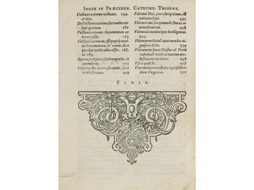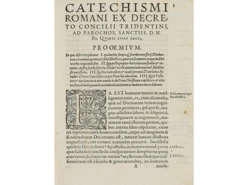 1577. LIBRO. (HUMANIDADES). CATECHISMUS EX DECRETO CONCILII TRIDENTINI. Ingolstadii: David Sartorius, 1577. 8º mayor. 4 h. + 550 p. + 11 h. Grabado calcográfico en la portada y anotaciones manuscritas de antiguo poseedor fechadas en 1778. Algo corto de margen superior, sin afectar caja de texto. Enc. en media piel, puntas, nervios, tejuelo, lomera cuajada, cortes pintados. Se trata de la primera obra encargada por el Concilio de Trento, junto al Breviarium y el Missale romanum, y constituye la esencia de las resoluciones del Concilio que debían renovar la iglesia católica en el s. XVI.