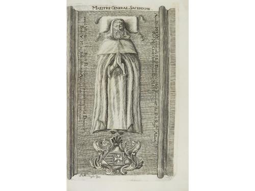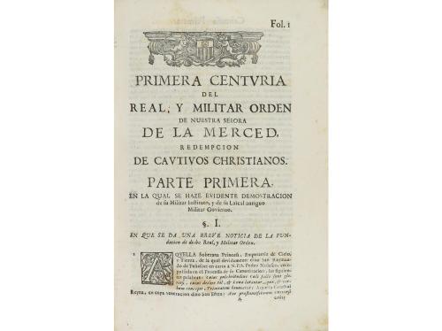 1726. LIBRO. (HUMANIDADES). RIBERA, MANUEL MARIANO:. CENTURIA PRIMERA DEL REAL, Y MILITAR INSTITUTO DE LA INCLITA RELIGION DE NUESTRA SEÑORA DE LA MERCED REDEMPCION DE CAUTIVOS CHRISTIANOS. Barcelona: Pablo Campins, 1726. Folio menor. Frontis grabado por Pauner + 40 h. + 636 p. + 38 h. Incluye cuatro retratos en el texto. Ligera sombra de óxido y algún pliego algo ácido. Enc. en pergamino de época. CCPB 403358-2. Palau 266961. Historia clásica de la orden de la Merced, escrita por el fraile Manuel Mariano Ribera, que como archivero de la orden, realizó una gran labor de documentación. Incluye un breve tratado sobre el idioma catalán.