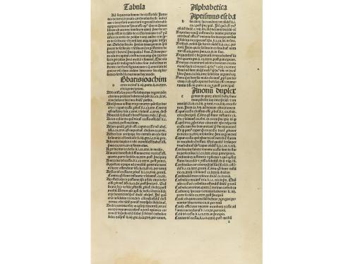 1496. LIBRO. (INCUNABLE). TURRECREMATA, HOANNIS DE:. SUM[M]E DE ECCLESIA DOMINI. Lugduni: Joannem Trechsel, 1496. 4º. Edición sin paginar, texto a dos columnas. Sign. 6, a8-h8, i6, k8-z8, A8-H8, J10. Apostillas marginales y manuscritas de época. Anotaciones manuscritas en la portadilla. Mancha de tinta en o7v que ha quemado el margen, alguna galería marginal. Enc. en plena piel, tejuelo, nervios, cortes pintados. CCPB 112922-8. ISTC it00556000. HC 15732. Goff T556.