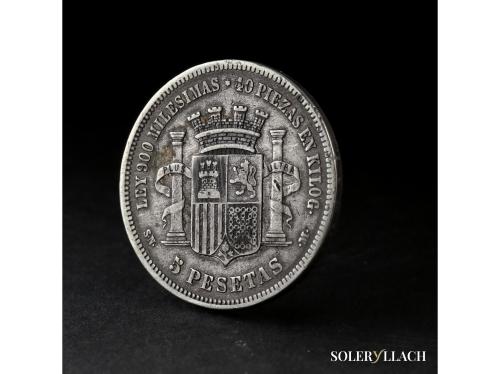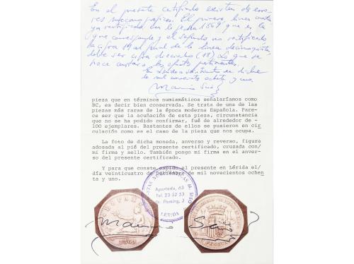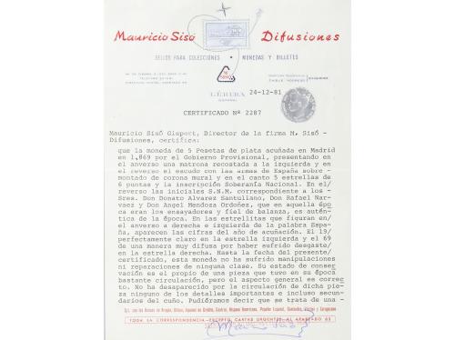 GOB. PROVISIONAL y I REPÚBLICA. 5 Pesetas. 1869 (*18-69). S.N.-M. 24,50 grs. Cifras de la 2ª estrella apenas visibles. Certificado de Mauricio Sisó Difusiones con fecha 24 Diciembre 1981. Una de las piezas más raras del período del Centenario de la Peseta. Pátina. MUY RARA. Tirada: 100 piezas. (MBC-).