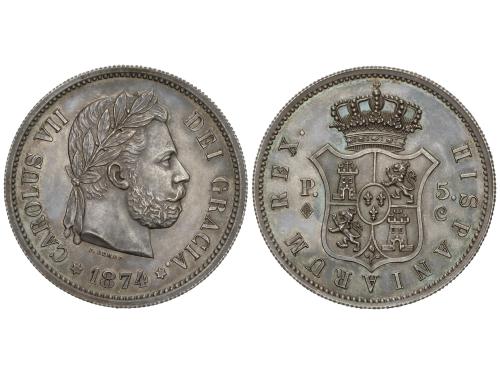 CARLOS VII Pretendiente. 5 Pesetas. 1874. BRUSELAS. 25,14 grs. AR. Fecha en anverso. Canto estriado. Pátina y brillo originales. MUY ESCASA. AC-11. FDC.