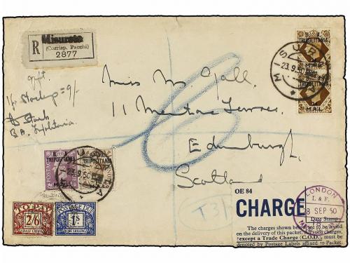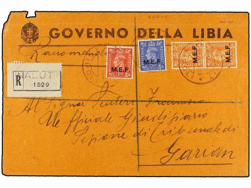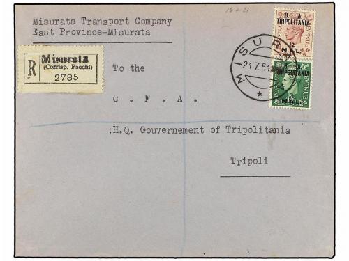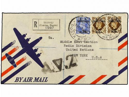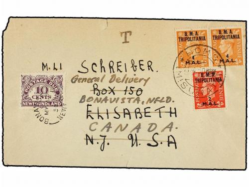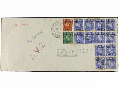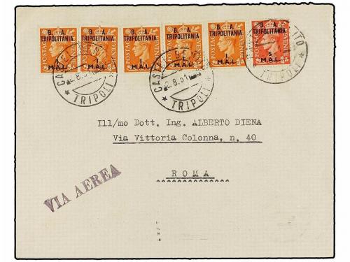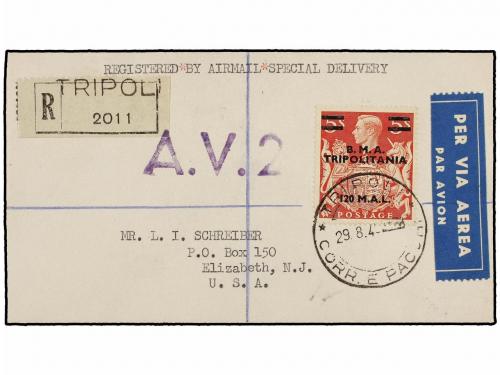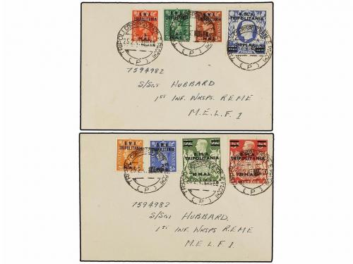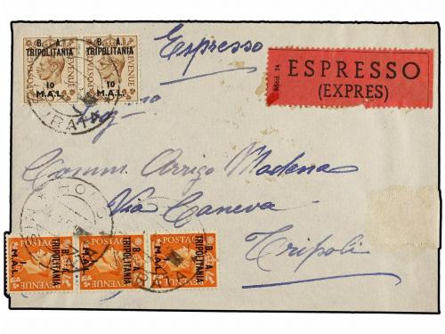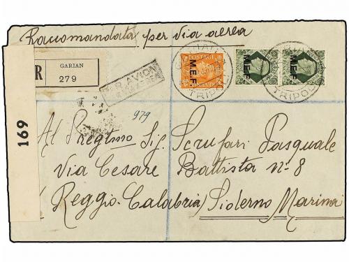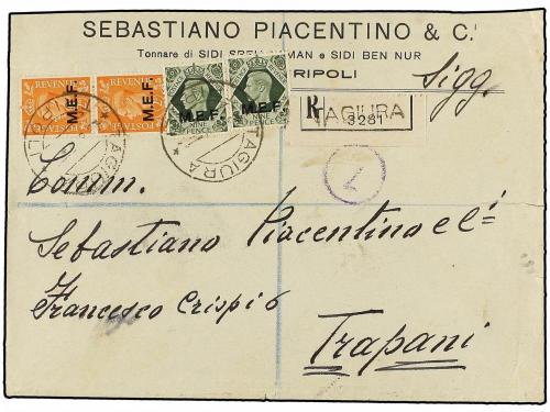 ✉ TRIPOLITANIA. 1947 (14-VIII). TAGIURA a TRAPANI. 2 d. naranja (2), 9 d. verde (2), mat. TAGIURA/TRIPOLI. MUY RARO (12 puntos), al dorso llegada.