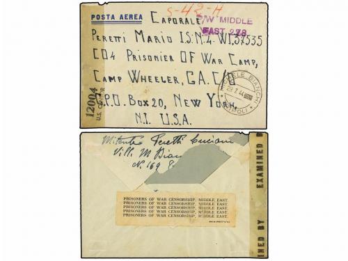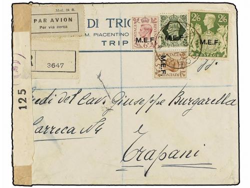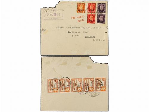 ✉ ETIOPIA. 1942 (22-VI). ADDIS ABEBA a NEW DELHI (India). Sobre circulado por las fuerzas de Ocupación Británica con sellos de 1 d. rojo (2), 2 d. naranja y 3 d. lila (2) con habilitación M.E.F. (tirada de Nairobi Sa. 1I (2), 2I, 4I (2)), mat. E.A./A.P.O. 55 (22-VI-1942) (East African Army Post Offices) de Abbis Abeba circulada vía Uganda con sellos de 10 cts. (5), mat. E.A./A.P.O.Z. de Nairobi. Marca de Censura con E.A. FORCES/N º 644. Defecto en la parte superior por mala apertura del sobre. Excepcional franqueo probablemente único conocido. No se tiene constancia del uso de sellos del M.E.F. en Abisinia.