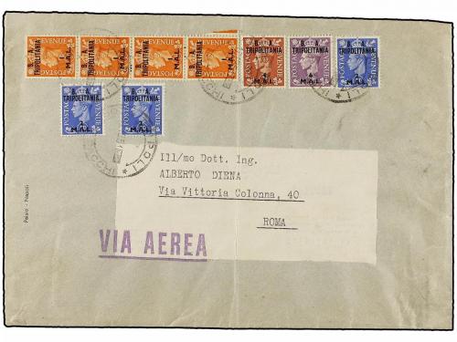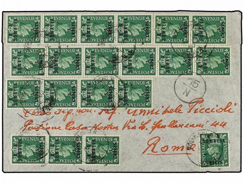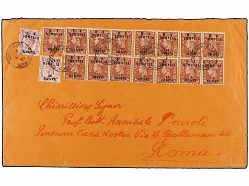 ✉ SOMALIA. 1950 (5-II). MOGADICCIO a ROMA. 15 cents. s. 1 1/2 d. castaño (15) y 50 cents. s. 6 d. rosa lila (2), al dorso llegada. Espectacular franqueo. (Sa. 6.800Ђ).