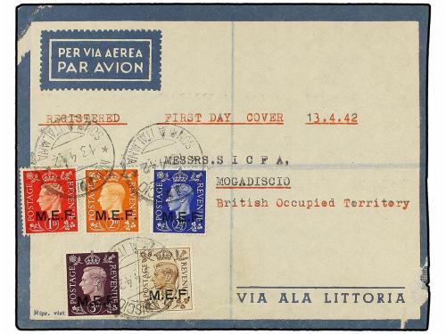 ✉ SOMALIA. 1942 (13-IV). MOGADICCIO. Serie completa (tirada del Cairo) en sobre no circulado, mat. del primer día de emisión.