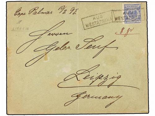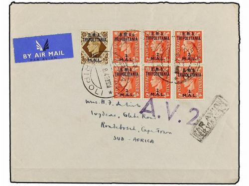 ✉ TRIPOLITANIA. 1943. GARIAN a CAPE TOWN (South Africa). 2 mal. s. 1 d. rojo (6) y 24 mal. s. 1 sh. castaño, mat. GARIAN/TRIPOLI. Circulada por Correo Aéreo, marca de Censura AV 2. Rara destinación.