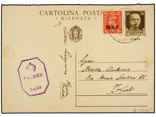 ✉ TRIPOLITANIA. 1943 (13-10). TRIPOLI. Entero Postal italiano de 30 cts. habilitado LIBIA en combinación con sello de 1 d. rojo de la Ocup. Inglesa M.E.F. Muy rara combinación.