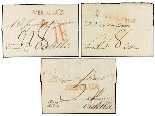 ✉ MEXICO. 1823 (19 Julio). FORTALEZA DE SAN JUAN DE ULUA a CALELLA (Barcelona). Carta completa fechada en VERACRUZ con la marca S.J.D. ULUA en rojo, manuscrito "Bergantini Firme" y porte de 5 reales. Acompañan el conjunto dos cartas de la misma correspondencia y fechadas en Veracruz el 12 Nov. y el 15 Dic. de 1821 con un interesante texto sobre la peculiar situación de la fortaleza de S. Juan de Ulua (enclavada en medio de la bahía de Veracruz) donde el Gobernador del Castillo se negó a entregar la Plaza a la autoridades mejicanas pese a haberse proclamado ya la independencia de México y amenazando con bombardear Veracruz si no se le proporcionaban víveres y se le pagaba un tercio de los derechos de los buques que entraran en el puerto. Conjunto excepcional y de gran interés histórico, última fecha conocida de la presencia española en México.