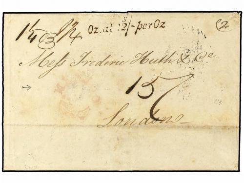 ✉ MEXICO. 1826. MEXICO a GRAN BRETAÑA. Marca circular MEXICO en color sepia aplicado en transito por JAMAICA (fechador al dorso) y marca OZ.AT 12s/per Oz. Carta algo humedecida pero muy rara.