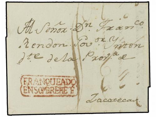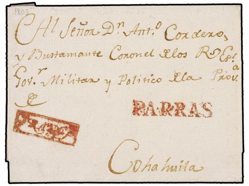 ✉ MEXICO. 1803 (12-Agosto). PARRAS a COHAHUILA. Marcas lineales PARRAS y FRANCA ambas en rojo. MAGNÍFICA y RARÍSIMA.