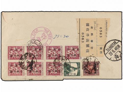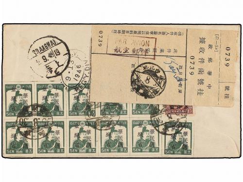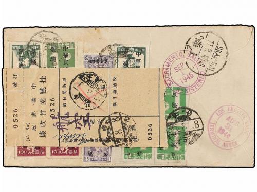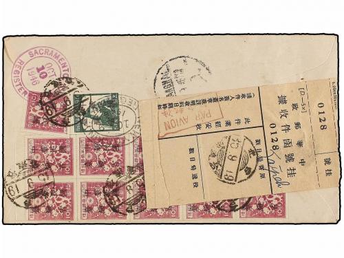 ✉ JAPON. 1946. JAPANESE OCCUPATION IN TAIWAN. TAIPEH to SACRAMENTO (U.S.A.). Air Mail registered cover franked with 15 cents brown, 5 yen green and block of seven 10 yen red lilac Japanese stamps ovpr. in Taiwan. Part of registered receipt attached. Transit of Shanghai and arrival to Sacramento. RARE high franking.