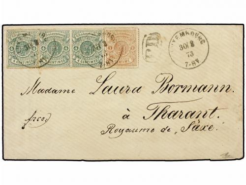 ✉ LUXEMBURGO. 1873 (Aug. 30). LUXEMBOURG to THARANT (Saxony), bearing a 1 c. and 4 c. green strip of 3 Arms type rouletted tied by cds LUXEMBOURG 30/8 73 7-8V. Rate to Germany was 1 sgr. or 12 centimes, 1 c. overpaid, since the 1 c. was the lowest denomination issued.