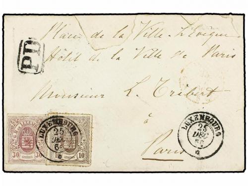 ✉ LUXEMBURGO. 1866 (Dec. 25). Christmas Day cover to PARIS franked by impeforate 1859-63 30 c. rose lilac and rouletted 1865-71 10 c. rose lilac tied by LUXEMBOURG cds. Framed "PD" above and reverse with (DEC 26) arrival cds. Cover tears at top but a unique mixed issue franking. Cert. R. GOEBEL.