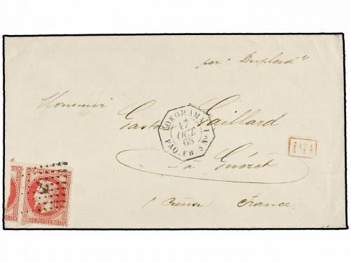 ✉ JAPON. 1874. NAGASAKI a LYON (Francia). Carta con el texto completo escrito en Nagasaki y depositada al correo de Shanghai. Franqueada con sellos franceses de 5 cts. verde y tira de cinco del 25 cts. azul. Mat. ROMBO DE PUNTOS 5104 y fechador SHANG-HAI/CHINE. Circulada a Francia por la vía de Bríndisi. MUY RARA.