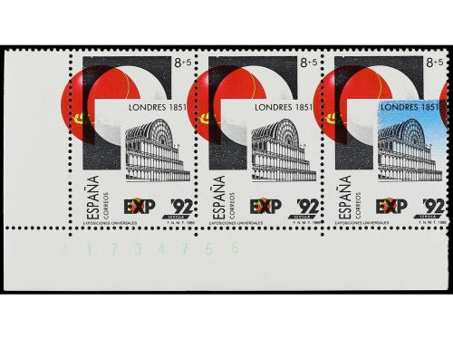 ** ESPAÑA. Ed. 2990 (3). Expo'92. 8+5 pts. multicolor. Tira de 3 IMPRESIÓN DEL ROJO DESPLAZADO a la izquierda, SIN IMPRESIÓN DEL AMARILLO y AZUL en dos sellos y SIN AMARILLO en un sello. RARO. Cert. GRAUS.