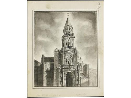 ESPAÑA. CASTILLO DE TORIJA (Guadalajara). Dos proyectos originales, uno a lápiz del Castillo y el otro realizado en acuarela del sello de 2 pts. terminado. Diseño y sello finalmente no adoptados. EXCEPCIONAL y ÚNICO.