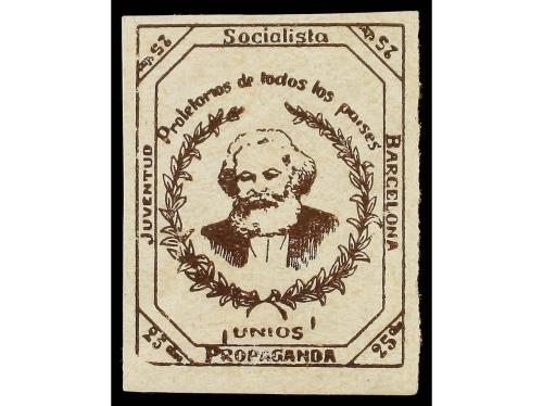 * ESPAÑA GUERRA CIVIL. BARCELONA. 25 cts. castaño. Juventud Socialista de Barcelona. Proletarios del Mundo Unidos con imagen de C. Marx. (Al. 141). RARÍSIMO.