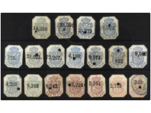 */° ESPAÑA: FISCALES. 1866. GIRO DE CONSUMO. Conjunto de 18 valores, la mayoría con pequeño taladro. Al. 1/20 .